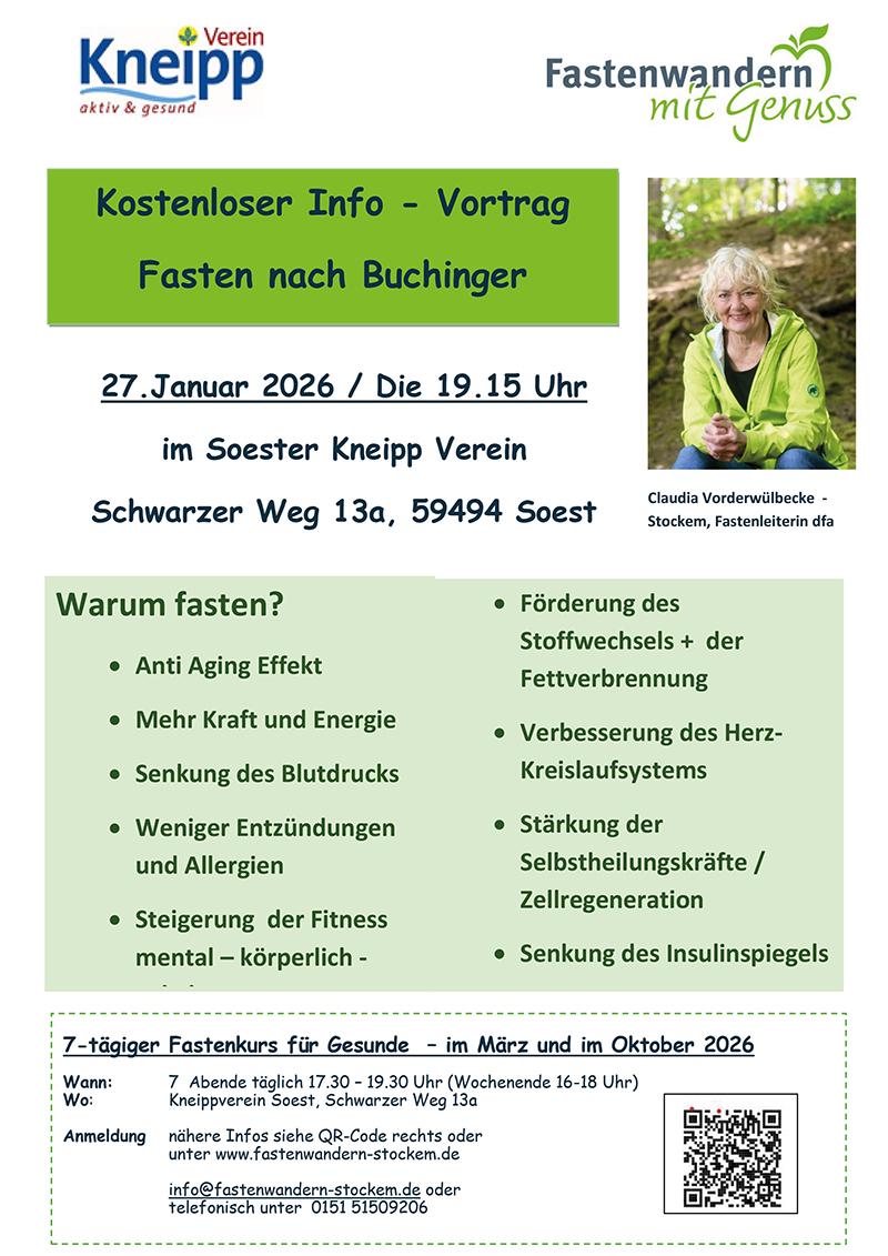 Wer sich vorab informieren wollte, war herzlich eingeladen am 27.1.26 um 19.15 Uhr zu meinem kostenlosen und unverbindlichen Infovortrag ins Kneipp Vereinshaus nach Soest, um mehr über das Fasten als wertvolle Gesundheitsprävention und zur Optimierung unserer Selbstheilungskräfte zu erfahren..